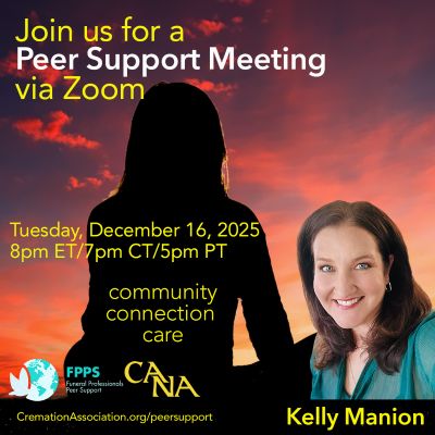 (Tomorrow night) Kelly Manion facilitates the monthly peer support meeting for us all to take some time to unwind with people who “get it.” With over 25 years dedicated to purpose-driven work in grief and over a decade of experience in the funeral service profession, Kelly understands the unique hardships and joys of this time of year. By providing space to talk about our grief, Kelly will help us understand the unique ways we all grieve and how to maintain our care for ourselves and our colleagues in the midst of it.”