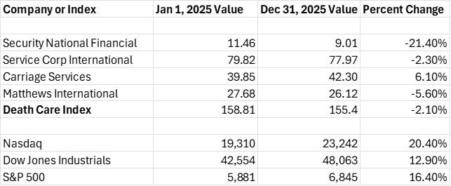 That might be an accurate description to give credence to where the stock prices of Death Care companies are today. You can take a look at the chart below and notice that the indexes of the Nasdaq, Dow Jones Industrials, and S&P 500 grew by 20.4%, 12.9%, and 16.4% respectively for the calendar year 2025. Those numbers represent a very good year for Wall Street and those that hold broad indexes of stocks.