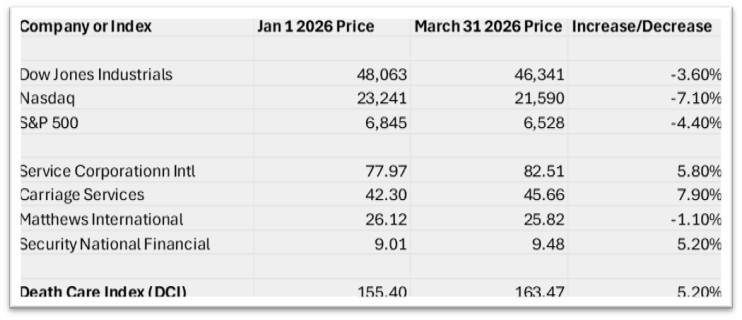 However, ten days is not a very long time. As I was preparing to do my report on the Death Care Index for the 1st Quarter of 2026 (January 1 through March 31), I made an interesting discovery. . . . . .For one of the first times, and maybe even the very first time since I’ve been doing this reporting with Funeral Director Daily, the Death Care Index, and each component of it, has outperformed all three of the major indexes (Dow Jones, Nasdaq, and S&P 500) for an entire quarter.