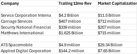 Disclosure: The author of this article for Funeral Director Daily is a shareholder of Service Corporation International, Carriage Services, Security National Financial Corporation, ATS Spacemobile, and Applied Digital Corporation.